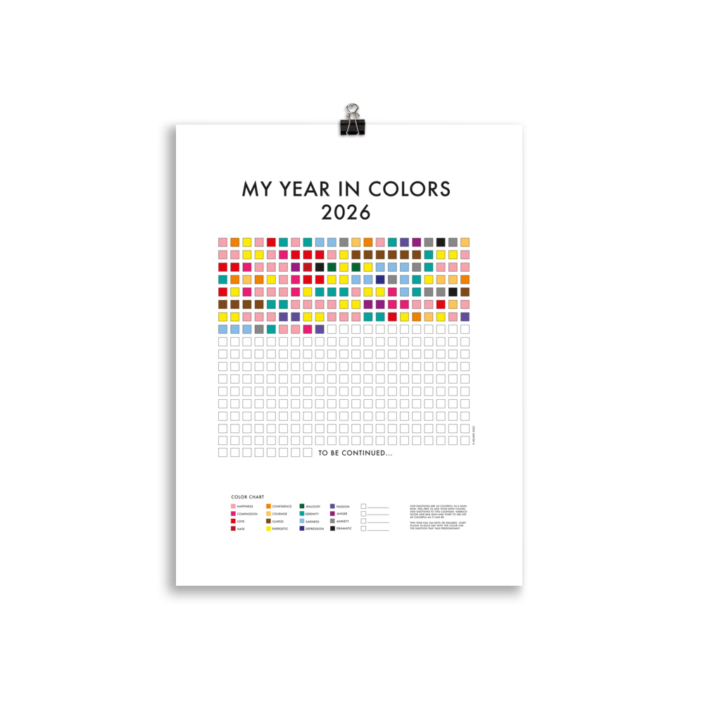 The "My Year in Colors 2026" calendar consist of over 365 squares to fill in. Each square equals one day in your life. Each color from the bottom color chart stands for an emotion...positive and negative. I chose all colors regarding standard color psychology concepts but feel free to add your own colors and emotions to the list.